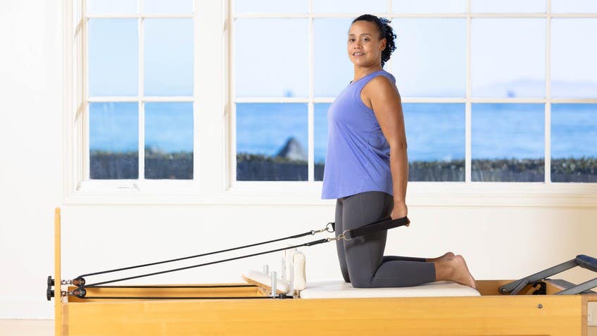 Now, here's the disclaimer about when you're kneeling. It might seem like it's all about your arms. It's really about your connection to the carriage. So when I come on for chest expansion, I wanna come kneeling, and I want to hook my feet on the back of the carriage. For some people, not a lot, but some people can come all the way to the actual front of their ankle and feel secure.